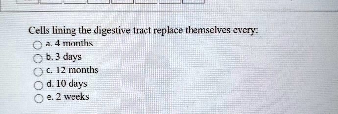 Solved Cells Lining The Digestive Tract Replace Themselves Every A 4 Months B 3 Days 12 Months D 10 Days E 2 Weeks